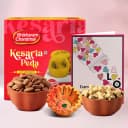 The Diwali Hamper consists of: - Diya - Kesaria Peda from Bhikharam Chandmal 500g - Almonds 100g - Cashews 100g - A Free Message Card Celebrate the festival of lights with our spectacular Festive Greetings With Diya Hamper. This thoughtfully curated gift is a perfect combination of traditional elements and delectable treats, making it a delightful choice for your loved ones. The centerpiece of this beautiful hamper is a stunning Diya, symbolizing the triumph of light over darkness. Crafted with intricate details, this Diya will add a touch of elegance to any home decor. Indulge in the rich and creamy Kesaria Peda from Bhikharam Chandmal. Made with the finest ingredients and flavored with saffron, each bite of these delectable treats will transport you to a world of blissful indulgence. To add a touch of wholesomeness, we have included a generous portion of almonds and cashews. These crunchy delights are not only a delightful snack but also packed with essential nutrients, making it a perfect choice for a healthy Diwali celebration. And to make this hamper even more special, we have included a free message card, allowing you to convey your heartfelt wishes to your loved ones. Bring joy and delight into the lives of your near and dear ones with our exquisite Festive Greetings With Diya Hamper. It’s a gift that truly encapsulates the spirit of this auspicious festival.