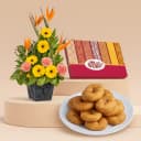 This gift combo includes: - Mixed Flowers Arrangement (3 Gerberas,4 Carnations and 3 Birds of Paradise) - Badusha (250 Gms) This unique gift combo features a vibrant arrangement of 3 Gerberas, 4 Carnations, and 3 Birds of Paradise, bringing together a lively mix of colors and textures. The exotic Birds of Paradise, along with the cheerful Gerberas and elegant Carnations, create a stunning floral display that is both bold and refreshing. Paired with 250 gms of sweet and flaky Badusha, this gift is perfect for those who appreciate a blend of nature’s beauty and a delicious traditional treat. Whether it’s a celebration, thank-you gesture, or a moment of appreciation, this combination delivers joy and indulgence.