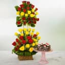 Celebrate life's special moments with this exquisite arrangement of red and yellow roses complemented by a delectable Black Forest cake. Housed in a beautifully tall basket, the vibrant bouquet features 50 stunning roses that symbolize love and appreciation, making it an ideal gift for anniversaries, birthdays, or just to lift someone's spirits. The included 1/2 kg Black Forest cake, layered with rich chocolate and whipped cream, promises to satisfy any sweet tooth. Together, this combination conveys heartfelt emotions, making every occasion a memorable one.