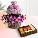 This gift combo includes: - 10 Purple Orchids N 5 Pink Roses Arrangement - Assorted Sweets (500g) This luxurious gift combo brings together the exotic beauty of 10 purple orchids and 5 pink roses in a stunning arrangement, paired with 500 grams of assorted sweets. The vibrant purple orchids symbolize admiration, respect, and dignity, while the soft pink roses add a touch of grace and elegance. Together, they create a floral display that is both sophisticated and eye-catching, perfect for expressing your deepest emotions or celebrating special moments. Accompanying this elegant bouquet is a box of assorted sweets, offering a delightful variety of traditional Indian confections that cater to all tastes. This combination of exquisite flowers and delicious sweets is a thoughtful and luxurious gift, ideal for anniversaries, birthdays, or any occasion where you want to leave a lasting impression.