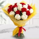 Pick this Glowing Marvel 30 Red N White Roses Premium Bouquet to greet the novel bride of your family and tie with her through floral radiance. This Assemblage presents Vibrant Red and White Roses combined together by Chic Ribbons and further decorated with Green Leaves.