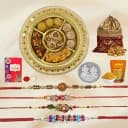 This Rakhi gift combo contains: - Assorted Sweets (500 gms) - Set of 4 Fancy Rakhi - Free Silver Plated Ganesh Laxmi Coin - Haldiram Bhujia (100g) - Almond Potli (100g) - Free Rakhi, Roli Tika N Chawal included Celebrate the cherished festival of Raksha Bandhan with a beautifully curated gift combo that blends tradition with indulgence. This thoughtful hamper features a Set of 4 Fancy Rakhis, each designed to express your heartfelt affection for your siblings. Complementing the festive spirit is a 500g box of assorted sweets, bringing with it a burst of traditional flavors to sweeten the occasion. The savory crunch of Haldiram Bhujia (100g) adds a spicy note, while a 100g almond potli brings a nutritious touch to the mix. A silver-plated Ganesh Laxmi coin adds an auspicious blessing, symbolizing good fortune and prosperity. With complimentary Rakhi, roli, tika, and chawal included, this combo is all about love, luck, and festive joy in every element.