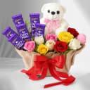 Add extra charm and sensation on Valentines Day with this Gorgeous Display of Mixed Roses n Cadbury Dairy Milk with Teddy in Basket and witness the heart of the recipient skip a beat after unwrapping it. This romantic surprise comes presented with 10 Mixed Roses n 6 pcs Cadbury Dairy Milk Chocolate (13g each) with 6 inch Teddy beautifully arranged in Small Cane Basket.