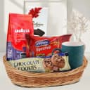 Experience a luxurious morning with our Gourmet Morning Delight Basket, featuring the rich aroma of Lavazza Ground Coffee (200 gm) alongside the wholesome crunch of McVities Digestive Cookies (200 gm) and Merba Imported Cookies (225 gm). Indulge your senses with a smooth Belgian Dark Chocolate Bar (100 gm) and enjoy your brew in the stylish Coffee Mug included. Perfectly presented in a charming small basket, this collection is ideal for gifting or personal enjoyment.