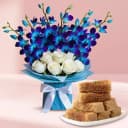 This gift combo includes: - 6 White Roses N 4 Blue Orchids Blue Tissue Wrapped Bouquet - Milk Cake (500 Gms) This elegant gift combo blends the timeless beauty of 6 pristine white roses with the exotic charm of 4 striking blue orchids, all wrapped in a delicate blue tissue for a touch of sophistication. The combination of these two contrasting yet complementary blooms symbolizes purity, serenity, and admiration, making it a perfect gesture for moments of celebration, appreciation, or even sympathy. Accompanying this stunning bouquet is 500 gms of delectable Milk Cake, a rich and creamy Indian sweet with a soft texture and a melt-in-your-mouth sweetness. This thoughtful combo is a delightful mix of floral elegance and traditional indulgence, perfect for adding beauty and sweetness to any occasion.