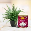 Embrace the essence of nature and indulgence with the Greenery & Sweetness Harmony set. Featuring the Bostern Fern, celebrated for its air-purifying capabilities, and a luscious 1 kg tin of Haldiram Rasgulla, this combination is a perfect blend of health and delight. The fern stands gracefully at 3 to 7 inches in height, beautifully arranged in a modern 3 to 4-inch plastic pot. Ideal as a thoughtful gift or a treat for yourself, it enriches any space with freshness and flavor.