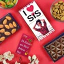 This gift box includes: - Personalized I love my Sister Chocolate bar (100g, Roasted DryFruit Filling and Cranberry Filling) - A Rakhi Theme Greeting Card Create unforgettable memories this Raksha Bandhan with our Personalized I Love My Sister Chocolate Gift Combo. This special gift box is thoughtfully curated to express your deepest affection for your sister. It includes a personalized I love my Sister chocolate bar (100g) with luxurious Roasted DryFruit and Cranberry fillings that promise a delightful taste experience. Alongside this sweet indulgence is a beautifully designed Rakhi-themed greeting card to convey your heartfelt wishes. The unique aspect of this gift is its personalization—you can upload a special photo and your name to be printed on both the box top and the chocolate bar. This added touch makes the gift not just unique but also deeply sentimental. Share the love, joy, and sweet moments with your sister this Raksha Bandhan by gifting her a present that shell always remember. Details needed: Upload N Mention your personalized Photo N Name which need to be Put on box Top N on Chocolate with your Alpha-numeric order id at: designphotocake@gmail.com or Whatsapp at +91 7980092029.