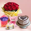 Shower the loved ones in your life with your love conveyed in the form of this Hearty Chocolate Cake, Ferrero Rocher, Roses, Teddy N Chocolates Combo and make the celebration for Valentines Day grandeur. This romantic gift combo includes: - A Bouquet of 15 Red Roses with Tissue Wrap - A Heart Shape Chocolate Cake (500 gm) - 5 pc Cadbury Dairy Milk Chocolate (12.5 grams) - An Adorable Teddy Bear (6 inch) - A Box of 16pc Ferrero Rocher Chocolates