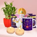 This Diwali Gift Hamper Has: - Polyresin Mukut Ganesh Idol - 2 Tier Lucky Bamboo Palnt - Happy Diwali Themed Ceramic Mug - Cadbury Dairy Milk Chocolate - 3 Pcs- 13.2 gms each - Scented T-Light Candle - Set Of 2 Create illuminating moments this Diwali with our thoughtfully designed gift set. It includes a scented T-light candle, filling your home with a soothing fragrance and a warm glow. The centerpiece of the set is a polyresin Mukut Ganesh idol, symbolizing wisdom and prosperity. Accompanying these elements are Cadbury Dairy Milk chocolates, adding a touch of sweetness to your celebrations. Embrace the joy and beauty of Diwali with this illuminating gift set.