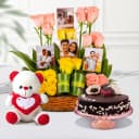 Home›Cake With Chocolates›Impressive Mixed Roses N Personalized Photo Basket with Love Cake n Soft Teddy