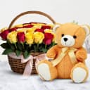 Express your feelings with this lively bouquet of yellow and red roses, teamed with an adorable plush teddy bear. This enchanting arrangement includes twelve cheerful yellow and twelve deep red roses, making it a perfect gift to show you care. The addition of a lovable 10-inch brown teddy bear adds a comforting touch, ideal for hugs and warmth. Whether celebrating a special occasion or simply wanting to brighten someone's day, this charming surprise is sure to bring joy.
