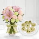 Shop Kaju Cake (500 Gms) from Mithas Delicious Sweets with a 8 Flowers Bouquet (Pink Lily, White Carnations N Pink Roses) to wish your loved ones on their special days. (Only Available at Pune)
