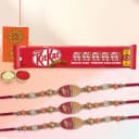 This is a gift of: - 6 Pcs Kitkat from Cadburys (108 gms) - 3 Rakhi - Roli Tika and Chawal Let sweetness meet sentiment with this thoughtfully arranged Rakhi gift set. It includes three beautiful Rakhis to honor the bond of love and protection, six Cadbury KitKat bars (108 grams total) to satisfy those celebratory cravings, and a pack of Roli Tika and Chawal to complete the traditional rituals. Whether youre sending it across the miles or hand-delivering it with a hug, this set makes a perfect choice to celebrate Raksha Bandhan with warmth, tradition, and the unmistakable crunch of a favorite chocolate.