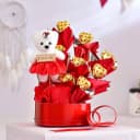 This valentine gift combo contains: - 9 Pcs Homemade Chocolates - Arranged in a Red Heart Shape Tin Box - A Cute Doll - Roses - A Valentines Day Card Treat your special someone with this Love Filled Valentines Arrangement. Open the heart-shaped tin to discover a treasure trove of 9 mouthwatering chocolates, each one a decadent delight. Alongside the chocolates, a delightful doll and a bouquet of fragrant roses complete this luxurious gift. The valentines day card will add an extra elegance to this combo. Indulge in love and create unforgettable memories this Valentines Day.