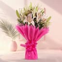 This bouquet is made of: - 5 Lilies - 8 Gladiolus Click to deliver this Lovely Bouquet of 5 Lilies and 8 Gladiolus wrapped with Tissue that delivers happiness instantly when unwrapped.