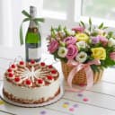 Order for delivery of Lovely Mixed Roses Basket with Butter Scotch Cake n Sparkling Juice to your special one. This flowers gift combo includes: Details:</br) Type of Flowers: Roses Flower Color: Assorted Type of Arrangement: Basket Type of Cake: Butter Scotch Cake Shape of Cake: Round Weight: 1/2 kg Type of Juice: Fruit Juice (Non Alcoholic) Volume: 750ml.