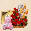 Lovely Red Roses N Personalized Photos Arrangement with Soft Teddy n Ferrero Moments
