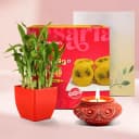 The Diwali Hamper consists of: - Diya - Kesar Laddu from Bhikaram Chandmal 500g - Three Tier Lucky Bamboo Plant with Pot - A Free Message Card Celebrate the festival of lights in style with our exquisite Lucky Bamboo, Sweets And Diwali Wishes Hamper. This thoughtfully curated hamper is designed to brighten up your festivities and make your loved ones celebrations even more special. The centerpiece of this hamper is a stunning Diya, a traditional symbol of light and positivity. Illuminating your homes with its warm glow, this Diya will create a magical ambiance during Diwali and beyond. But thats not all! Indulge your sweet tooth with the delectable Kesar Laddu from Bhikaram Chandmal, a renowned name in traditional Indian sweets. Bursting with the rich flavors of saffron and sweetness, these laddus are sure to delight your taste buds. For a touch of green and luck, we have included a Three Tier Lucky Bamboo Plant with Pot. Known for its auspiciousness and charm, this plant is a perfect addition to your festive décor or a thoughtful gift to bring prosperity to your loved ones homes. And as a special touch, we are including a free message card, so you can express your heartfelt Diwali wishes to those dear to you. Make this Diwali a truly unforgettable one with our Lucky Bamboo, Sweets And Diwali Wishes Hamper that radiates joy, sweetness, luck, and love.