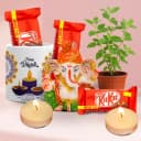 This Diwali Gift Hamper Has: - Polyresin Pagdi Ganesh Idol - Religious Tulsi Plant - Happy Diwali Themed Ceramic Mug - Nestle KitKat Chocolate - 3 Pcs- 12.5 gms each - Scented T-Light Candle - Set Of 2 Celebrate Diwali with your loved ones. Gift them this Luminous Diwali Blessings Hamper and make them feel your presence on this festive day.