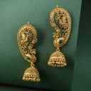 Step into the realm of time-honored beauty with our majestic peacock gold jhumka earrings. Each earring features an exquisite peacock design nestled in a rich golden framework, encrusted with brilliant emerald-green gems. The vintage gold finish enhances the intricate details, including delicate feather motifs and floral engravings that celebrate Indian craftsmanship. The dome of the jhumka is artistically adorned with a charming lattice pattern and accompanied by graceful pearl drops that flow elegantly, making them perfect for festive occasions or as a thoughtful gift.