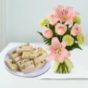 Shop Malai Burfi (250 gms) from G Pulla Reddy with a 8 Flowers Bouquet (Pink Lily, White Carnations N Pink Roses) to wish your loved ones on their special days. (Only Available at Hyderabad)