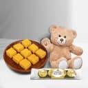Shop Mango Malai Barfi (500 Gms) from Karachi Sweet Mart with a 6in Teddy N 4pcs Ferrero Rocher Chocolate Pack to wish your loved ones on their special days. (Only Available at Pune)