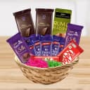 This Gift Basket consists of: - 5 pcs Cadbury Dairy Milk (13 gms) - 2 pcs Cadbury Dairy Milk Silk (70 gms) - 1 pc Cadbury Temptation (Rum n Raisin-72 gms) - 1 pc Cadbury Temptation (Almond-72 gms) - 2 pcs Nestle Kitkat (10 gms) - 2 pcs Cadbury Bournville (31 gms) - 1 Gift Basket A gift that speaks the language of chocolate, this hamper is packed with richness and variety. From the classic five Cadbury Dairy Milk bars (13 gms) to the velvety Dairy Milk Silk bars (70 gms), every bite brings joy. The sophisticated Cadbury Temptation bars—Rum n Raisin and Almond (72 gms)—are perfect for more mature palates, while the two Nestlé KitKats (10 gms) offer crispy, lighthearted fun. Two Cadbury Bournville bars (31 gms) lend a bold, cocoa-forward finish. Presented in an elegant basket, this hamper makes a thoughtful and indulgent gift for any chocolate admirer.