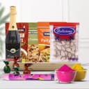Enter into the heart of someone you admire by gifting this Marvelous Assorted Dry Fruits n Grape Drink Gift Hamper that wonderfully paves a way for you on this Holi. This Holi gift hamper comes with: 1. Valentino Sparkling Red Grape Drink (750 ml) 2. Tong Garden Cocktail Nuts Mix(65g) 3. Tong Garden Party Snacks (65 g) 4. Salted Pistachio (100 g) 5. Tong Garden Mexican Style Peanuts (65 g) 6. Handmade Crunchy Chocolates (6 pcs) 7. 1 Pichkari 8. Free Colorful Herbal Gulal (2 pkts) 9. All are arranged in a Wooden Gift Tray