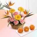 This gift combo includes: - Mixed Flowers Arrangement (3 Gerberas,4 Carnations and 3 Birds of Paradise) - Sahi Laddu (400g) Brighten someones day with this vibrant gift combo featuring a mixed flowers arrangement of 3 gerberas, 4 carnations, and 3 Birds of Paradise, paired with 400 grams of Sahi Laddu. The mixed flowers, with their cheerful colors and varied textures, create a lively and uplifting arrangement that symbolizes joy, love, and happiness. The exotic Birds of Paradise add a tropical flair, while the gerberas and carnations bring a sense of warmth and cheer. Paired with this beautiful floral display is Sahi Laddu, a rich and decadent Indian sweet that offers a luxurious burst of flavor with every bite. This combo is perfect for celebrating joyful occasions, expressing your appreciation, or simply adding a touch of tropical beauty and sweetness to someones day.