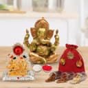 Deliver happiness on Bhai Dooj with this Gift of Nutty Dry Fruits Potli with Vinayak Murti N Mandap online for your Brother and make him happy. This gift comes with 450 gms assorted Dry Fruits in Potli like Almond, Cashew and Raisins with Gold Plated Vinayak Murti N antique Ganesh Laxmi Mandap. Free Roli, Tika and Chawal is also included with the gift item.
