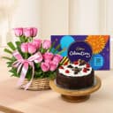 This gift combo has: - 12 Pink Roses Arrangement - Black Forest Cake (1Lb) - Cadbury Celebrations Astonish your friends and family by bringing to your celebration, this perfect Combo of 1 Lb Black Forest Cake, 12 Pink Roses Arrangement with Cadbury Celebrations and show your class of choice.