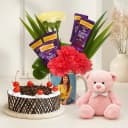 Give a lovely surprise to your loved ones on Valentines Day with this gift of a Personalized Photo Mug of 5 Yellow N Pink Carnations n 5 Cadbury Dairy Milk Chocolate Bar (13g each) amazingly coupled with a Black Forest Cake (500g) n a 6 inch Cute Teddy and create magical moments to cherish forever. Details needed: Send a digital photo with your Alpha-numeric order id at: designphotocake@gmail.com or Whatsapp at +91 9230721098.