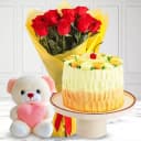 This gift combo has: - 10 Red Roses Bouquet - Pineapple Cake (1Lb) - A Small Teddy Order this online gift of delectable 1/2 kg Pineapple Cake with 10 Red Roses Bouquet small Teddy and make the events of your close ones more special from miles away.
