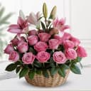 Send lovely wishes with this Pink Elegance Floral Basket and spread love among the people you care for. Product Details: Flowers: 25 Pink Roses, 3 Stems Pink Lilies (3*3 buds/flowers) Gift Type: A Basket Arrangement