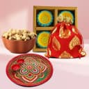 This Diwali Gift Hamper has: - Designer Diwali Pooja Thali - Cashew In Designer Potli -100 gms - Designer Clay Diyas - Set Of 4 Celebrate Diwali in style with our Celebrate Diwali in Style Gift Hamper. Overflowing with delights and decorative delicacies, this hamper is sure to make your festivities extra special. The eye-catching Designer Diwali Pooja Thali sets the tone for elegance, while the set of 4 Designer Clay Diyas adds a touch of charm to your home. And lets not forget the 100g pack of Cashews, a treat that will leave you craving for more.
