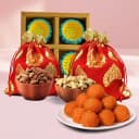 This Diwali Gift Box has: - Cashew In Designer Potli - 100 gms - Almond In Designer Potli - 100 gms - Motichoor Ladoo -200 gms - Designer Clay Diyas - Set Of 4 Send this Premium Nutty n Chocolaty Treats to your relatives and friends and make them surprised on this Diwali.