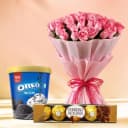 This gift combo has: - 10 Pink Roses Tissue Wrapped Bouquet - Kwality Walls Oreo N Cream Ice Cream Tub (700ml) - 4pc Ferrero Rocher Chocolate Box Render happy moments to your loved ones as you send online Pretty 10 Pink Roses Bouquet in tissue wrapping with Kwality Walls Oreo N Cream Ice Cream Tub (700ml) n 4pc Ferrero Rocher Chocolate Box and frame it forever in your memory and heart.