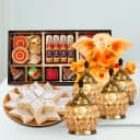 This Diwali Gift Hamper has: - Vignesh Ganesh - Kaju Katli -200gms - Cracker Shaped Assorted Handmade Chocolates - Designer Crystal Led Light - Set of 4 Ignite the festive spirit and spread joy with this Diwali gift hamper that promises to dazzle and delight. Bursting with surprises, it includes a charming Vignesh Ganesh idol, symbolizing wisdom and prosperity. Indulge their sweet tooth with the scrumptiousness of Kaju Katli, a traditional Indian delicacy that will leave them craving for more. Adding a touch of whimsy, the hamper also features an assortment of cracker-shaped handmade chocolates, bringing a playful twist to their Diwali celebrations. And to illuminate their homes with a warm glow, the hamper includes a set of four designer crystal LED lights. Surprise your loved ones with this captivating gift hamper and make their Diwali truly memorable.