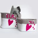 This is a gift of: - Set of 2 Baskets Introducing our Pure Cotton Storage Basket Set by Yellow Doodle, the perfect blend of beauty and sustainability. Handmade with care in India, these storage baskets are crafted from 100% cotton rope, free of chemicals and toxins, making them a safe and eco-friendly choice for your home. The set includes one medium basket measuring 30 x 20 x 20 cm and one large basket measuring 40 x 30 x 30 cm, offering ample storage space for various items. These charming baskets are not only practical but also add a pop of color and happiness to any room, especially in a little ones nursery. Ideal for new parents, these gender-neutral baskets make a thoughtful baby shower gift. Easy to clean with a simple hand wash or wipe, these baskets are both functional and stunning. Embrace simplicity, sustainability, and style with our Earthly Bliss Storage Bins. *Note: Colour - Pink, Easy to clean, simply hand wash or wipe with a damp cloth. PS- Personalisation (if any) could be on the medium basket/ large basket or both.