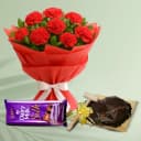 Enrich the flavour of love on Valentines Day with this gift of Radiant 12 Red Carnations Tissue Wrapped Bouquet, Chocolate Love Hammer Cake (500g) and Cadbury Dairy Milk Silk Chocolate Bar (60g) and see the joy it brings to the life of the recipient.