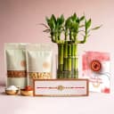 Celebrate the special bond of brotherhood with our Raksha Bandhan Delight gift set. This charming collection includes a beautifully crafted Rakhi, symbolizing your love, paired with a delightful mix of premium dry fruits. The 200 grams of succulent Cashews and Almonds not only make for a delectable treat but also represent the strength of your relationship. Completing this thoughtful gift is a lovely 2-tier Lucky Bamboo Plant, a timeless symbol of prosperity and good luck, perfect for brightening your brother's space. Additionally, the set includes a heartfelt Rakhi Card and the traditional essentials—Roli, Tika, and Chawal—ensuring your celebration is complete with love and joy.