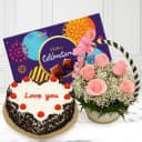 Present your loved ones this Ravishing Pink Rose Basket with Black Forest Cake n Cadbury Chocolates. This flowers gift combo comprises of: Details: No. of Flowers: 12 Type of Flowers: Rose decorated with Greens Flower Color: Pink Type of Arrangement: Basket with Handle Type of Cake: Black Forest Cake Shape of Cake: Heart Shape Topping on Cake: Love You Weight: 1kg Type of Chocolates: Cadbury Celebrations Weight: 215g.