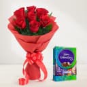 This gift combo has: - 10 Red Roses Bouquet - Cadbury Mini Celebrations Pack (70 gms) Gift this package of 10 Red Roses Bouquet, wrapped by a tissue with Cadbury Mini Celebrations Pack (70 gms) to your loved ones as an expression of your gratitude.