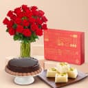This gift combo includes: - 12 Red Roses in Glass Vase - Coconut Kalakand (400g) - Chocolate Cake (1 Lb) Make any celebration grand with this luxurious gift combo featuring 12 red roses in a glass vase, 400 grams of Coconut Kalakand, and a 1 lb chocolate cake. The red roses, elegantly arranged in a clear glass vase, symbolize deep love and passion, making them perfect for romantic occasions or heartfelt expressions. Complementing the roses is Coconut Kalakand, a creamy, rich Indian sweet with a delightful coconut flavor that melts in the mouth, offering a unique and exotic taste experience. To add a final touch of indulgence, this combo includes a decadent chocolate cake, rich and moist, perfect for celebrating special moments. This gift combo is ideal for anniversaries, birthdays, or any occasion where you want to make a lasting impression with elegance and sweetness.
