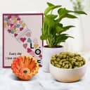 The Diwali Hamper consists of: - Diya - Pudina Cashews 100g - Money Plant with Pot - A Free Message Card Make this Diwali extra special with our delightful Refreshing Diwali Delights Hamper. Packed with love and the essence of festivities, this hamper is the perfect gift for your loved ones. The centerpiece of the hamper is a beautifully handcrafted Diya, symbolizing the triumph of light over darkness. It not only spreads warmth but also adds a touch of traditional charm to any home. Indulge in the rich and crunchy treat of Pudina Cashews, carefully curated to provide a burst of flavors. These perfectly roasted cashews, seasoned with a hint of refreshing mint, will leave your taste buds craving for more. And thats not all – we have included a resilient Money Plant, believed to bring good fortune and prosperity. This delightful addition comes complete with its own pot, making it effortless to bring some greenery and positivity into any space. To add a personal touch, we have also included a free message card, where you can pen down heartfelt wishes for your loved ones. So why wait? Make this Diwali truly memorable with our Refreshing Diwali Delights Hamper that radiates joy, blessings, and happiness.