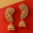 Unveil your inner royalty with these stunning gold plated earrings, intricately crafted in the form of a peacock. Sparkling white stones beautifully frame the ornate design, elevating its elegance. Detailed feather engravings and floral patterns evoke a rich cultural heritage, while vibrant ruby accents provide a cheerful pop of color. Adorned with delicate filigree and petite pearl fringes, these earrings are a perfect match for traditional outfits like sarees and lehengas, making them a superb choice for weddings and festive occasions.