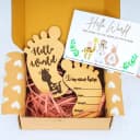This gift box contains: - A Pair of Hello World Feet Shaped Baby Announcement Plagues Celebrate the arrival of your little one in style with our Remarkable Feet Shaped Baby Announcement Plague Gift. This high-quality sign is the perfect way to share the joyous news of your new arrival with friends and family. Personalize it with your babys name and use it as a photo prop to capture those precious early moments. The pair of Hello World Feet Shaped Baby Announcement Plaques are not only a stylish addition to your home decor but also a lasting memory of your childs special day. Once youre done using it for photos, repurpose it as a fridge magnet to keep the memories close at hand. This plaque also makes for a thoughtful baby shower or new baby gift, sure to be cherished by the new parents. Order yours today and create a beautiful keepsake to cherish those special moments forever.