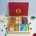 Remarkable This gift box contains: - A Almond Finger - 4 pcs Seeds Squares - 4 pcs Assorted Chocolates (Orange Crisp, Cranberry) - 2 Nankhatai - A Pack of Kachori (5 pcs) - Kesarai Thandai (50 gms) - A Bottle of Salted Almonds - A Box of Holi Colour (4 pkt, 60 gms each) Celebrate any occasion with our Remarkable Festive Treats Box, a beautifully curated assortment of sweet and savory treats that are sure to bring joy to your festivities. This box of delights is a perfect balance of flavors and textures, offering a delicious mix of Almond Fingers, Seeds Squares, Assorted Chocolates, Nankhatai, Kachori, Kesarai Thandai, Salted Almonds, and vibrant Holi Colors. Indulge in the rich and crunchy Almond Fingers, savor the delightful burst of flavor from the Assorted Chocolates, and enjoy the traditional taste of Nankhatai. The Kachori adds a savory touch, while the Kesarai Thandai provides a refreshing and aromatic experience. Complete your celebration with a handful of Salted Almonds and add a splash of color with our vibrant Holi Colors. Treat yourself or gift this Joyful Festive Treats Box to a loved one for a truly memorable and delicious experience.