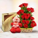 Imagine a vibrant basket filled with 25 luscious red roses, artfully arranged to create a breathtaking display. Nestled within this floral masterpiece is a charming 6-inch teddy bear, ready to offer comfort and joy. To elevate this gift even further, a decadent box of 16 Ferrero Rocher chocolates adds an indulgent touch, each piece promising a delightful flavor experience. This exquisite gift set is more than just a present; it's a sentimental gesture overflowing with love, perfect for making lasting memories. Let this enchanting arrangement convey your heartfelt emotions!