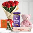 Ignite the spark of love with this enchanting assortment that beautifully blends floral elegance with comforting sweetness. A bouquet of six stunning red roses expresses heartfelt emotions, complemented by a snuggly 6-inch teddy bear that brings joy to any occasion. Indulge in a creamy Dairy Milk chocolate, satisfying every sweet yearning, while a traditional Rakhi, along with Roli Tika and Chawal, adds a touch of culture to your heartfelt gift. This delightful combination is more than just a present; it's a cherished memory waiting to be made.